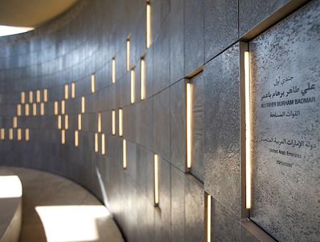 يُغطى سقف الجناح بثمانية ألواح ترمز إلى الإمارات السبعة بينما يمثل اللوح الثامن شهداء دولة الإمارات العربية المتحدة. ويوجد في منتصف الجناح عمل فني يتكون من ألواح زجاجية شفافة كبيرة تمثل الإمارات السبعة ويحيط بها بركة يجري من خلالها الماء، بينما يحيط بكل لوح من الجانبين الأمامي والخلفي نقش بقسم الجنود يمكن للزوار قراءته من أي جانب.