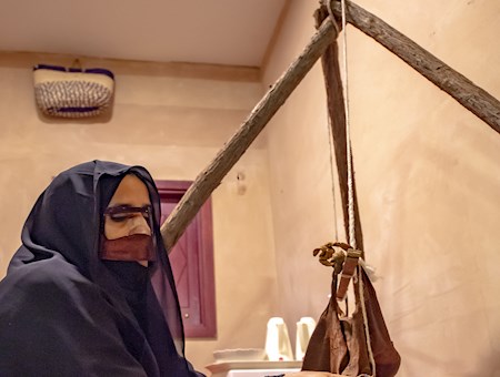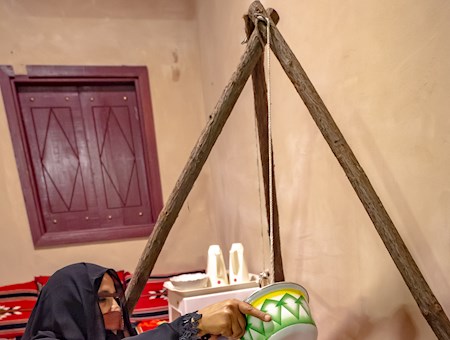 حيث تجلس المرآة القرقصاء بمحاذاته لإمساكه من الحبل والقيام بعملية خض اللبن داخل " السقا " الذي يختلف في الحجم ، بين كبير ووسط وصغير .