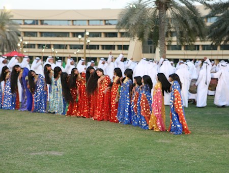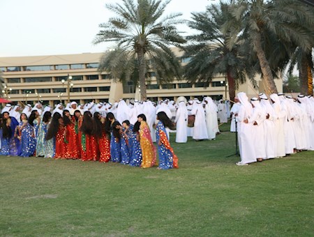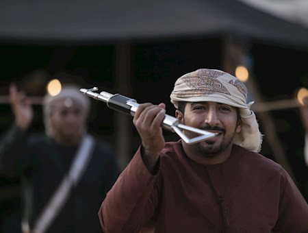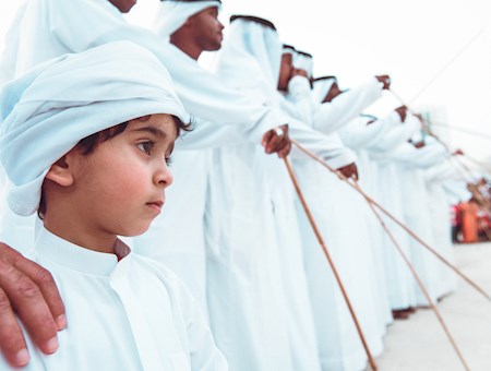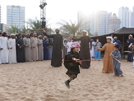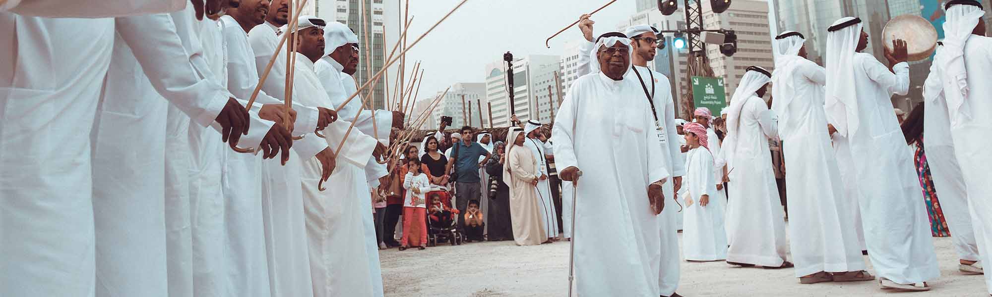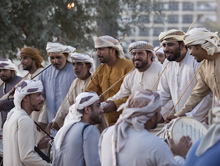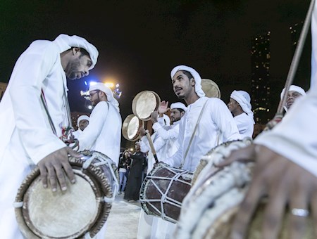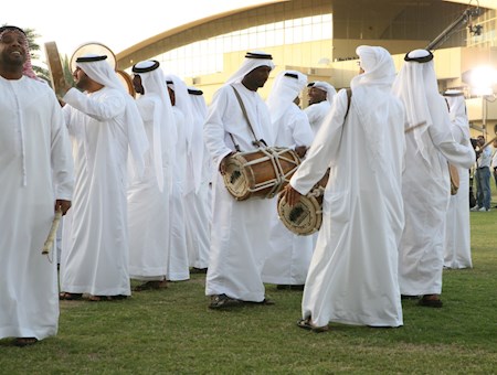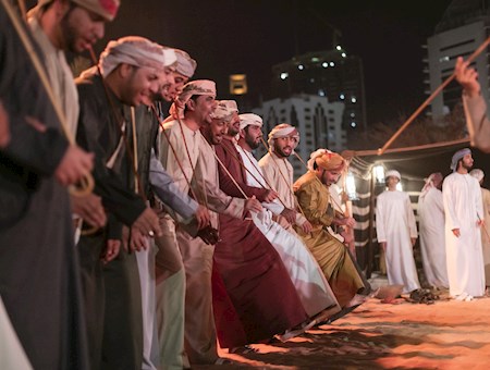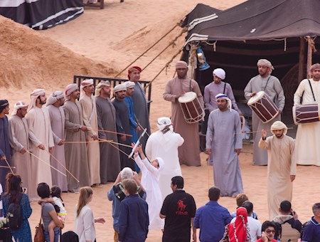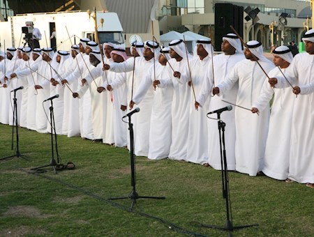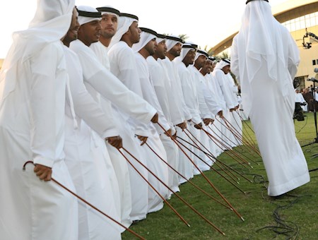 Al-abu (le père) donne et maintient le rythme, tandis que les batteurs se tiennent entre les deux rangées d'hommes, portant de gros tambours.