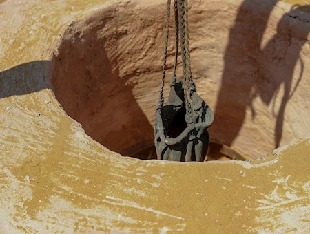 Le narrateur, Umm Saeed Al Shamsi, mentionne également qu'ils creusaient le tuwayan1 après s'être assurés qu'il y avait de l'eau en dessous, puis ils retiraient2 l'eau sale du puits, un seau après l'autre, afin d'avoir accès à une eau pure et limpide, surtout après s'être débarrassés de la saleté et de la boue du puits. Ce n'est que lorsque cette eau restait stable et plate qu'ils pouvaient obtenir une eau potable et consommable3. Fatima Al Kindi partage cet avis, en disant : Lorsque l'on creuse un puits et que l'on atteint le niveau de l'eau au fond, l'eau extraite serait pleine de saletés et d'impuretés, donc en répétant le processus et en continuant à extraire l'eau, elle se purifierait et la saleté stagnerait au fond du puits, ce qui permettrait d'obtenir une eau propre.4
